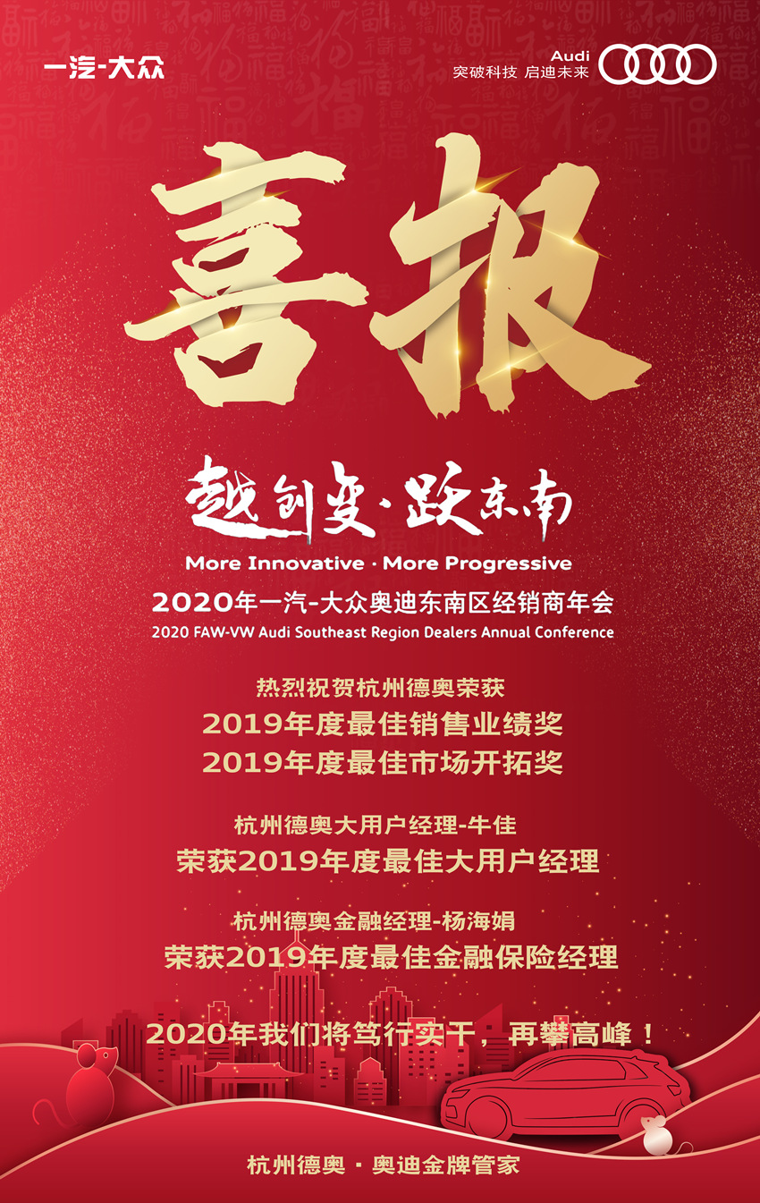 2020年1月6日,“越創(chuàng)變·躍東南”2020年一汽-大眾奧迪東南區(qū)經(jīng)銷商會(huì)議在美麗的東海之濱---舟山隆重舉行。杭州德奧汽車有限公司憑借2019年度優(yōu)異的經(jīng)營(yíng)業(yè)績(jī)及出色的運(yùn)營(yíng)表現(xiàn),再次獲得多項(xiàng)殊榮:年度最佳銷售業(yè)績(jī)獎(jiǎng)、年度最佳市場(chǎng)開(kāi)拓獎(jiǎng)、年度最佳大用戶經(jīng)理、年度最佳金融保險(xiǎn)經(jīng)理。