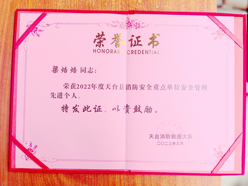 天臺金恒德梁焙焙榮獲“2022年度天臺縣消防安全重點單位安全管理先進個人”稱號